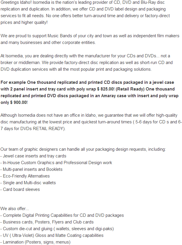 Please visit the QUICK QUOTE page on our website for requirements invloving  smaller quantities of duplicated CD-R or DVD-R discs. For a custom quote (click here), or send an email to sales@isomediainc.com. You can also call us on 1-888-663-1656 to discuss your project for CD replication, CD duplication, DVD replication, or DVD duplication. We are happy to help.